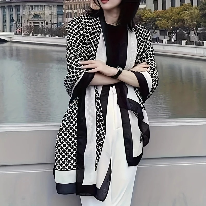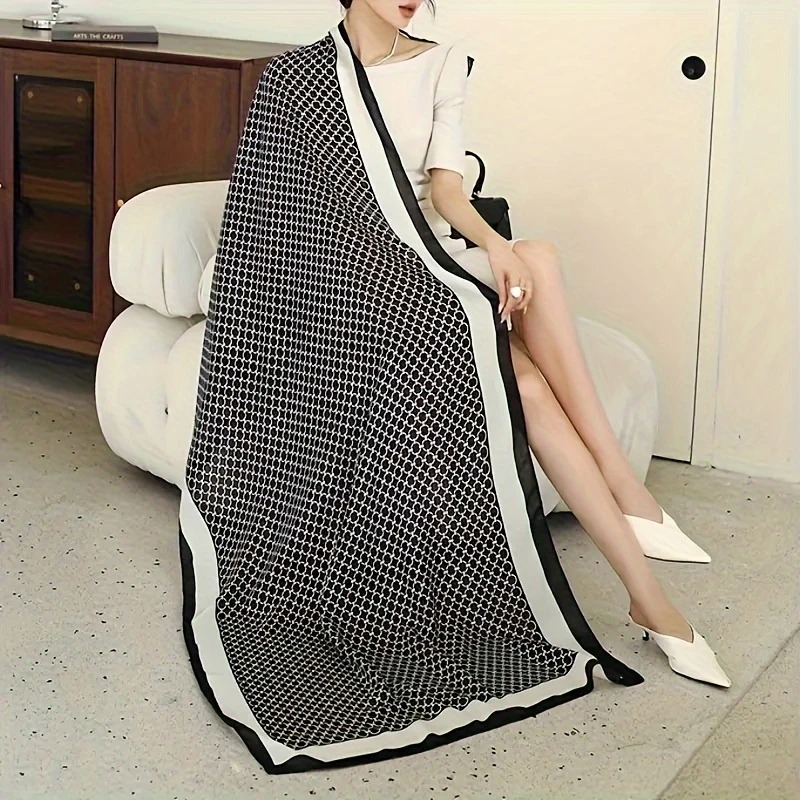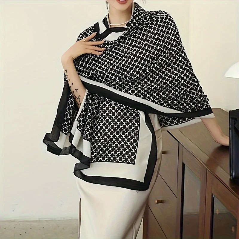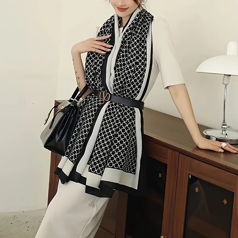 Elevate your outfit with this large boho-style scarf featuring refined geometric patterns. Its light, flowing texture drapes beautifully over the shoulders, perfect for evenings out, everyday styling, or as a beach wrap.