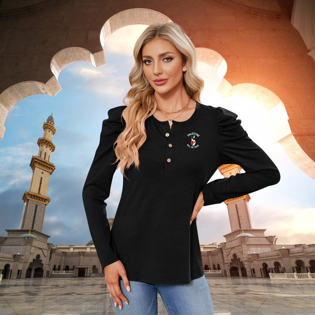 The puffed sleeves bring a modern, sophisticated touch, while the decorative buttons on the front add classic and refined charm. Ideal for the fall and winter seasons, this versatile T-shirt pairs perfectly with casual or dressy styles. Match it with jeans for a chic everyday look or with a skirt for an elegant outfit.
