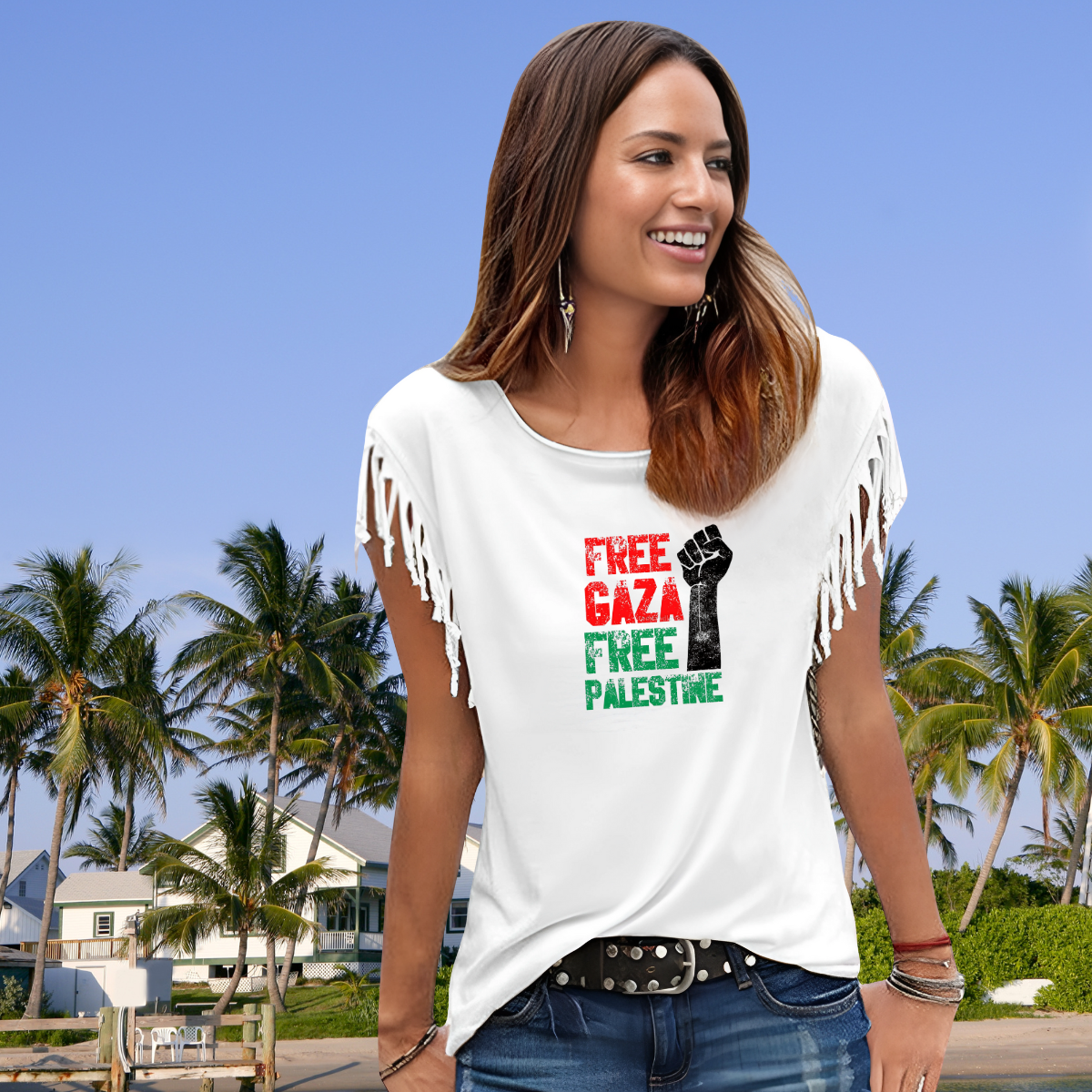 This fringe sleeve cotton t-shirt is more than just a piece of clothing – it’s a statement of solidarity and a celebration of cultural pride. Crafted from premium cotton, it ensures lightweight comfort, making it ideal for summer days and casual outings. The elegant fringed sleeves add a playful, boho-chic vibe that elevates any outfit.