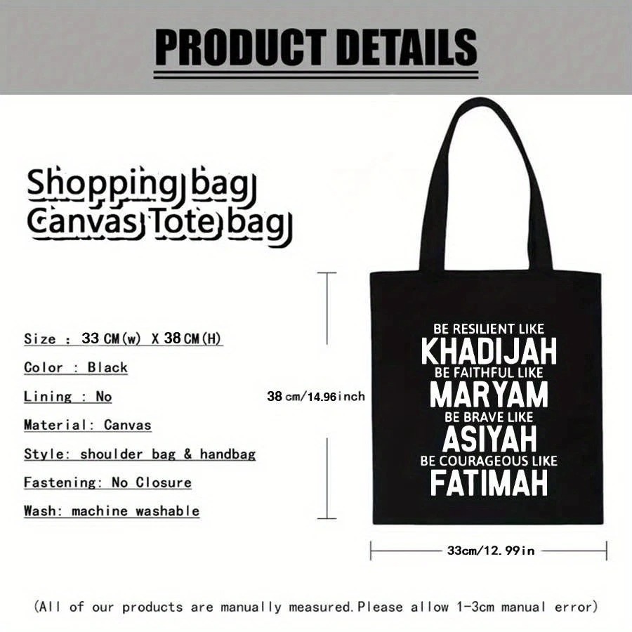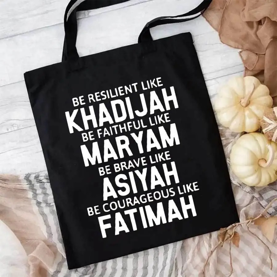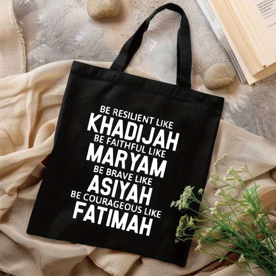 This black canvas tote bag pays tribute to four iconic women of Islam: Khadijah, Maryam, Asiyah, and Fatimah. A meaningful message printed on a minimalist, modern design – perfect for daily use, school, or gifting.