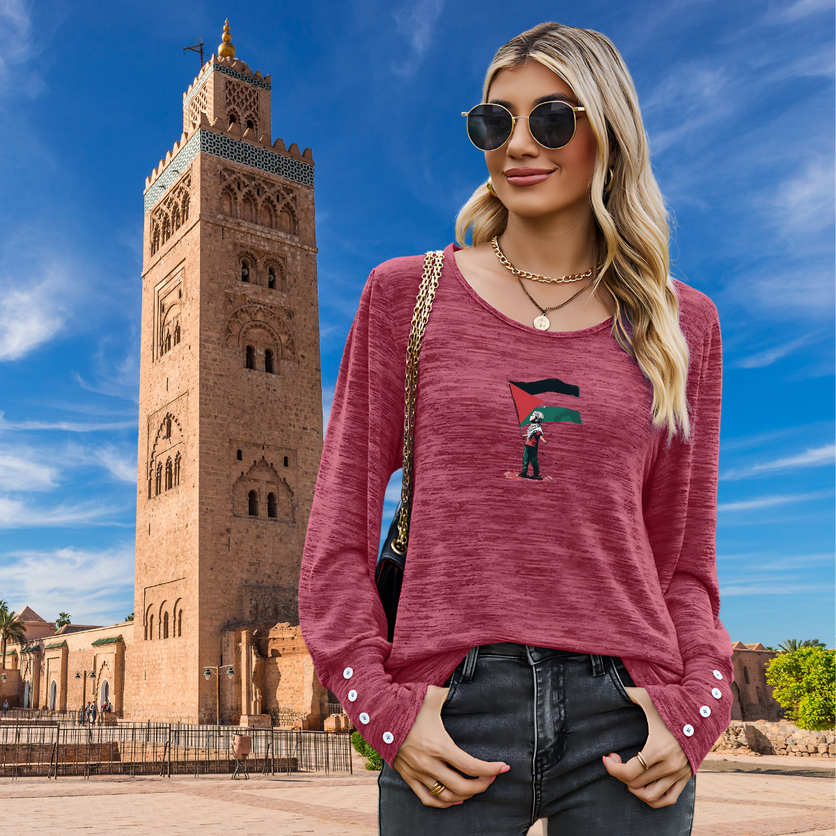 This long-sleeve T-shirt embraces the harmony of comfort and style while carrying a message of solidarity and support. Crafted from a soft and stretchy blend of polyester, rayon, and spandex, this top offers a lightweight and flowing feel that moves gracefully with you. The refined button details on the cuffs add a touch of sophistication to this versatile design, perfect for casual days or semi-formal occasions.