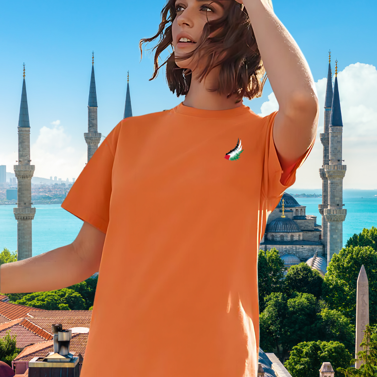 This t-shirt reflects values of authenticity and simplicity. By choosing this product, you also support Palestine, as part of the proceeds is donated to humanitarian associations working for peace and solidarity.