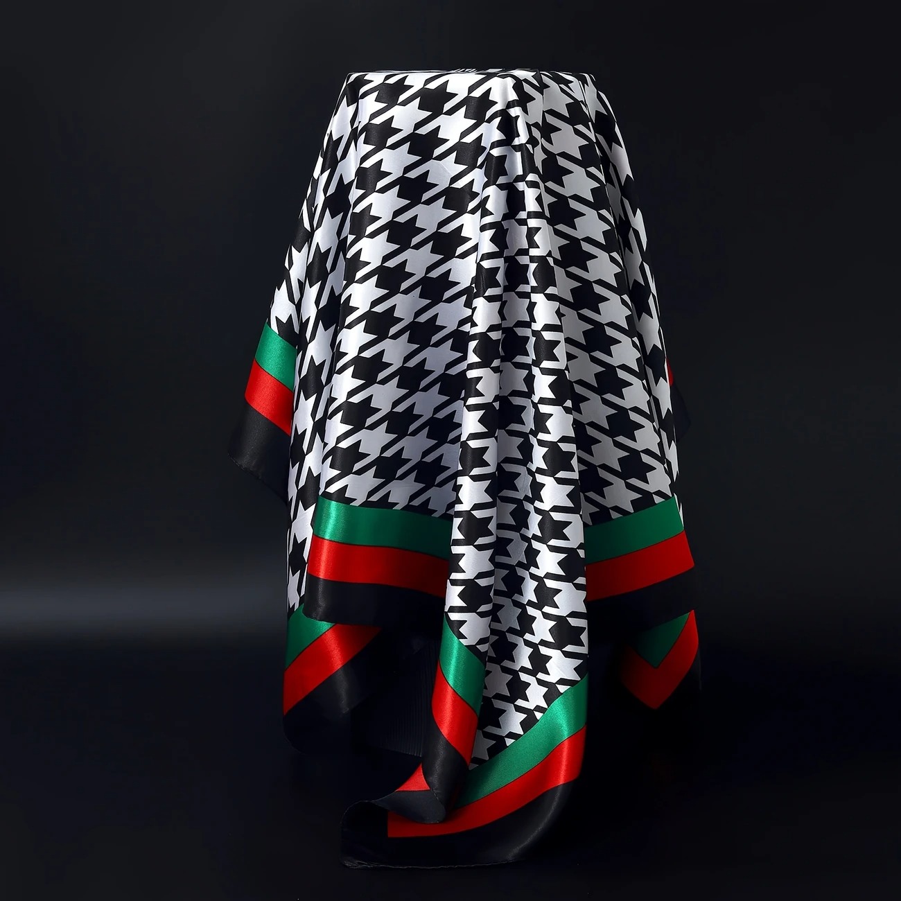 This black and white satin square scarf is a timeless, elegant accessory for any wardrobe. The houndstooth print adds a refined touch to both casual and formal outfits.